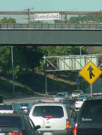 Rumsfail (rums´ · fāl), v., 1. To self-destruct, melt-down or implode under the weight of one's own arrogance. 2. To fail spectacularly, particularly in matters of warfare or diplomacy; to plunge into chaos. 3. Absolute, unmitigated disaster of national or international proportions and consequence; policy failure so utterly abject and miserable as to approach the realm of the epic. "Although long considered to be a costly and murderous fiasco, the prisoner abuse scandal revealed the war in Iraq to be nothing short of a rumsfailure." See also: "Karma"